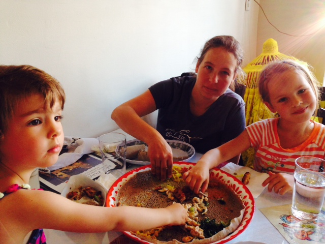 Comment faire comprendre aux filles qu’elles vont avoir à ouvrir leurs horizons au-delà des macaronis-mozzarella et des bananes? Solution: Détour au resto ethiopien du coin (Fraser&Broadway à Vancouver) pour un dépaysement rapide. Manger avec les doigts, rouler des légumes épicés dans une crêpe au sarrazin… Le voyage commence dans notre quartier!