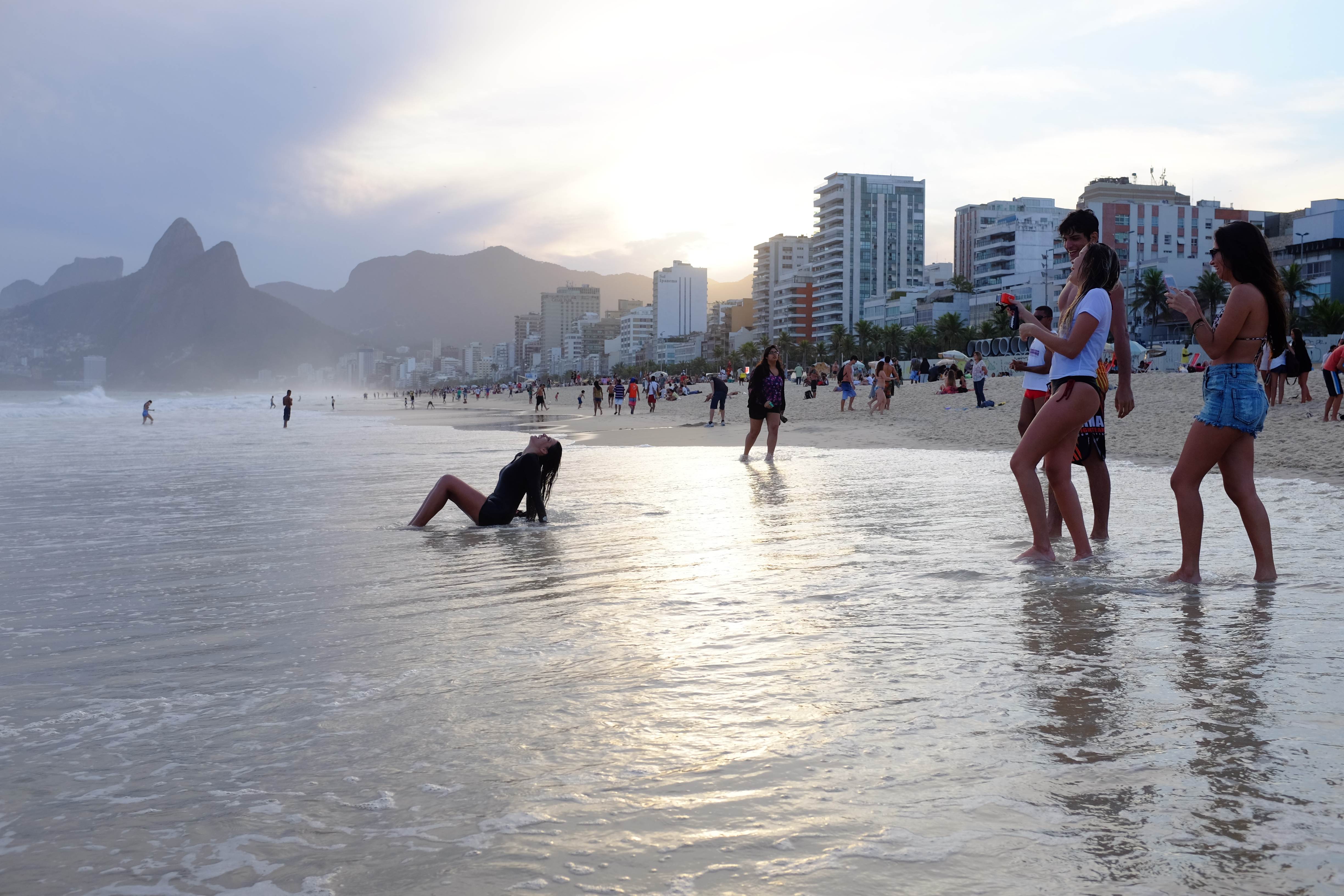 Déjà c’est l’hiver. Pas de fêtes sur les plages. Les cariocas, c’est le nom des résidents de Rio, considèrent que c’est l’hiver malgré les 26-27 degrés et l’eau tout de même bien plus chaude que sur les plages du Finistère (Bretagne, là où ce n’est JAMAIS l’été). Vous auriez du voir la tête de nos amies brésiliennes quand je me suis baigné à Ipanema après le coucher du soleil. Les filles étaient en train de faire des châteaux de sable en maillot de bain, et nos amies étaient emmitouflées des pieds à la tête, en train de grelotter!