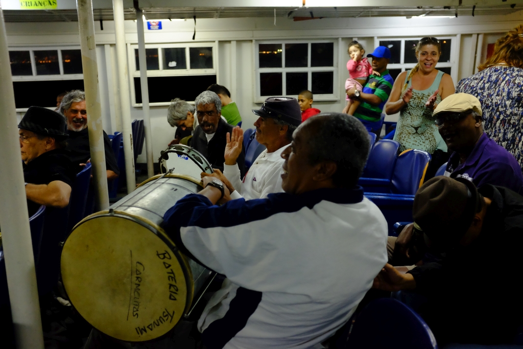 Dans le traversier de retour. Orchestre de samba impromptue.