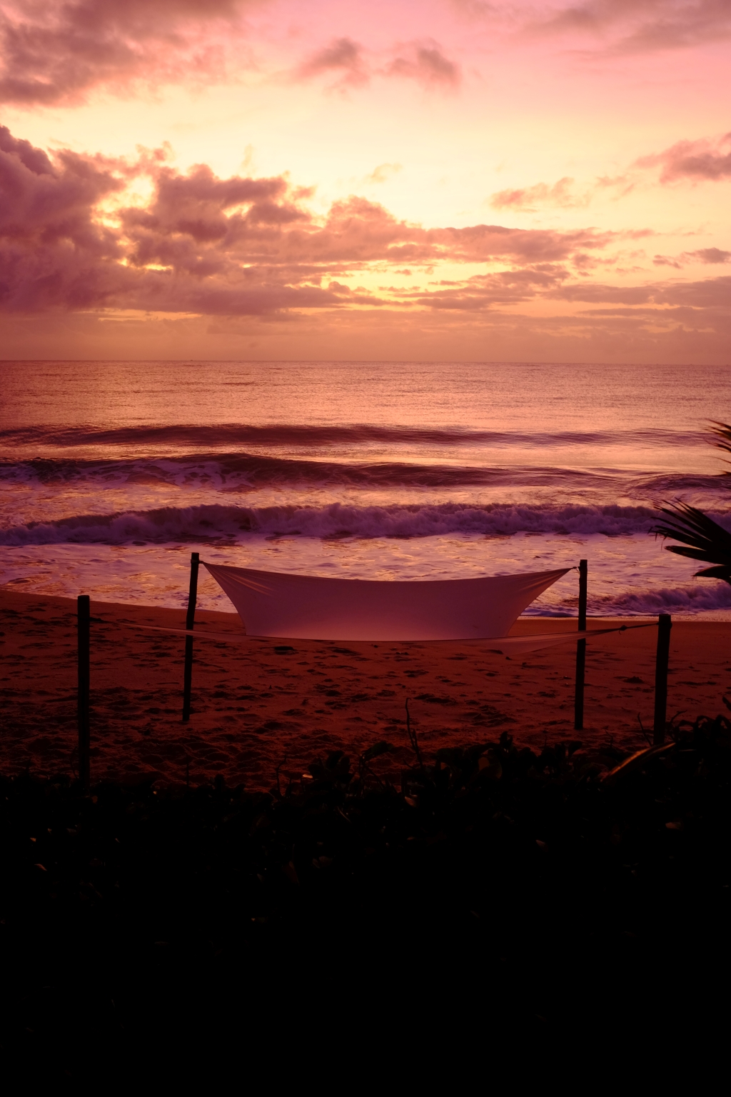 Lever du soleil à Caraïva. 5h30!. Chargés comme des mules avec nos sacs, nous devons prendre une charette pour nous rendre à l’embarcadère. La charette ne viendra pas. 25 minutes de marche dans le sable.