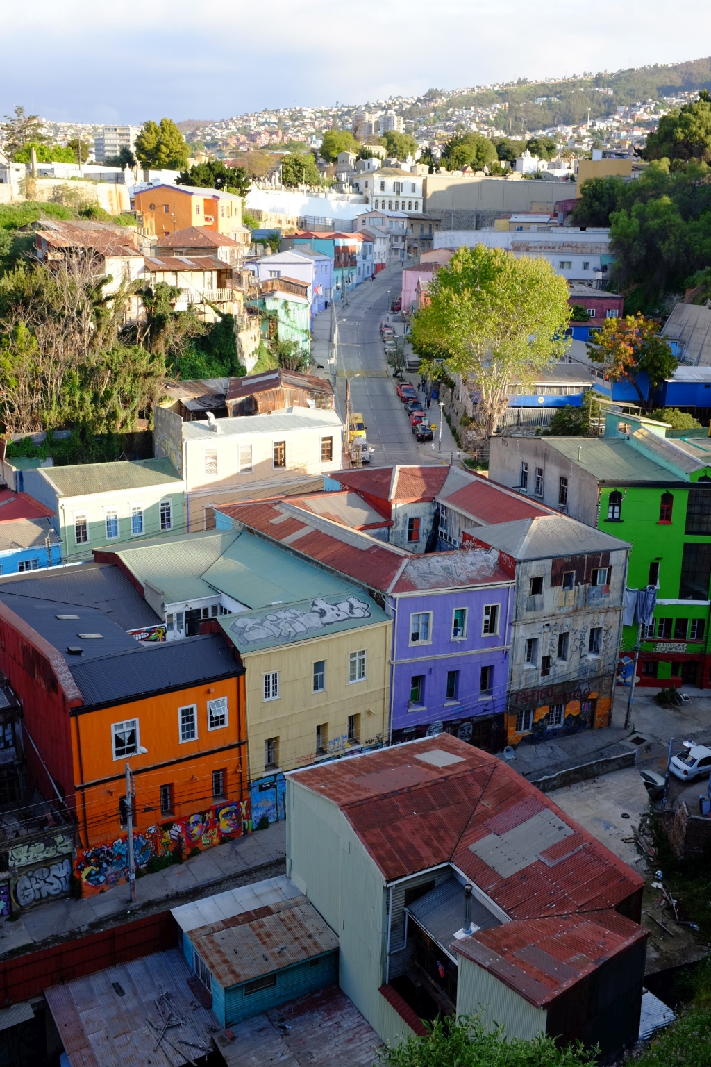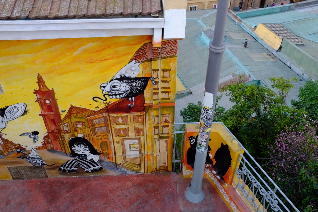 Ce qui frappe à l’arrivée, c’est le relief: Valparaiso est construit en partie sur des collines qui dominent l’océan, tout en courbes. Ensuite, ce sont les couleurs: Escaliers, maisons, toits, tout est vif, gai, audacieux.