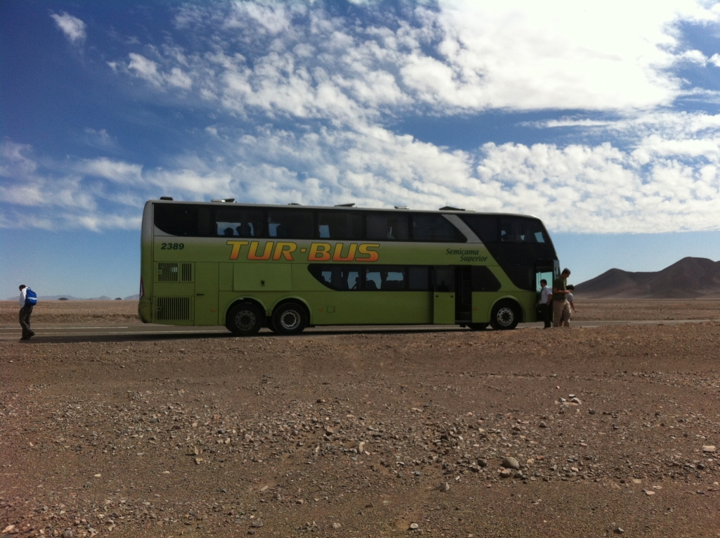 Coup d’œil dehors. Le soleil tape. Il est 15 heures, il n’y a presque pas d’ombre. Agitation du côté des 3 membres d’équipage. On sent que ça ne tourne pas rond. La panne est confirmée. On est prisonniers du désert. Pour combien de temps? Oh, une heure ou deux, ou plus, on ne sait pas quand ils vont nous renvoyer un autre autobus, nous dit un chauffeur pas rassurant, apparemment blasé et pas vraiment inquiet. Euh, c’est que vous n’avez pas deux petites filles avec vous! Aucune directive des employés de Turbus, pourtant l’une des plus grosses compagnies de transport du pays. Un passager bondit hors de l’autobus, fait du stop, et s’en va sans un mot. Habitué?
