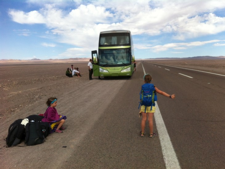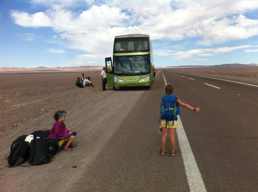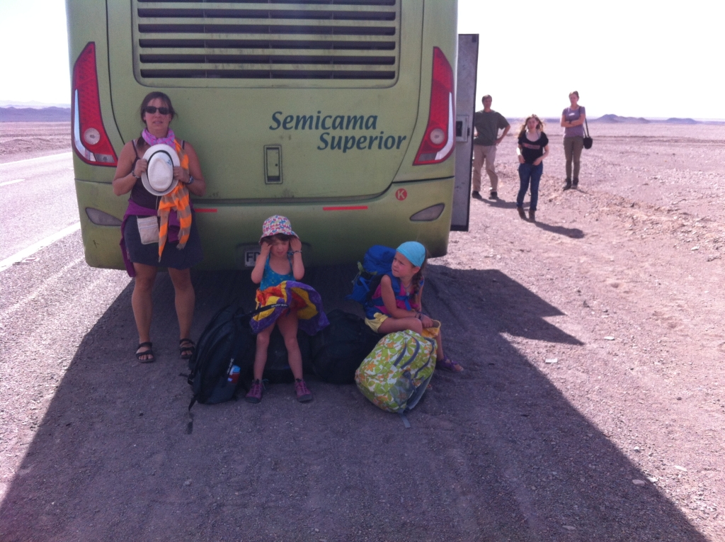 On sort de l’habitacle surchauffé. Finalement, il fait plus frais dehors, dans le filet d’ombre à l’arrière de l’autobus. Inquiétude pour les enfants. Crème solaire, eau, beaucoup d’eau. Les filles ne se doutent de rien. Tranquilles, elles veulent jouer, comme toujours. Euh, c’est qu’on est bloqués dans le désert le plus sec du monde, au bord d’une autoroute pleine de camions poussiéreux qui roulent à tombeau ouvert!