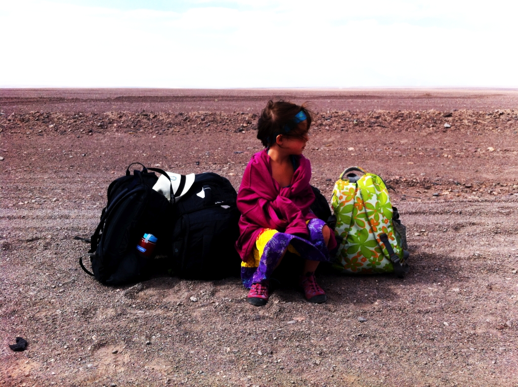 Finalement, devant l’indifférence totale des chauffeurs, on reprend nos bagages et on fait comme tout le monde, on se plante sur le bord de la route, le pouce à l’air. Seulement maintenant on est une dizaine à faire la même chose. Finalement, les autres nous aident, ils font du « pouce » pour nous. Avoir des enfants, ça aide… Puis après quelques essais infructueux, on décide de mettre les filles en avant. Qui n’est pas attendri par une blondinette de 7 ans qui fait du stop en plein désert?