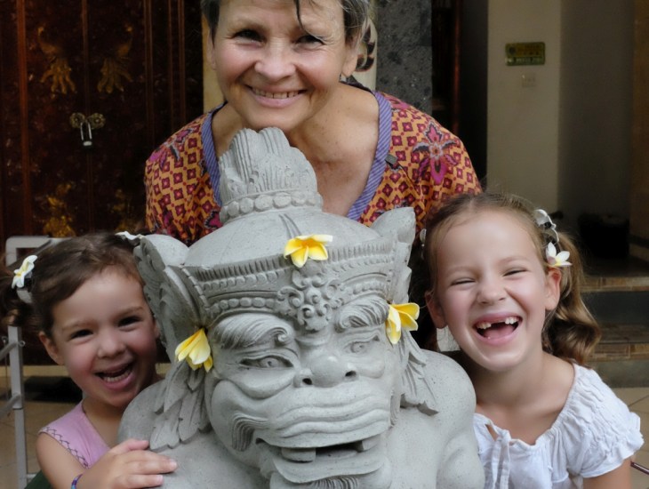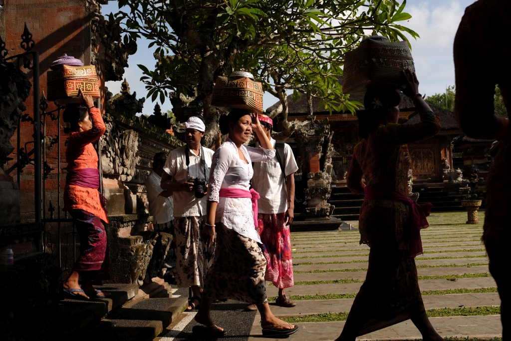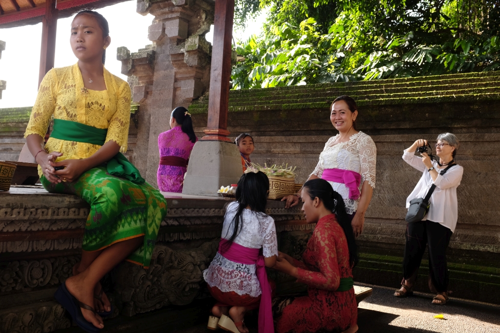 Maintenant on est à Bali. On est arriver au mauman de la fête Galungan. C’est une fête où les personnes qui sont mortes à la gerre (et aussi les autres, précise Anaïk au moment de la transcription) revivent. Ils ont installé plein de Penjor ce sont des grandes cannes de bambou pleines de décorations, chaqe maison en a un devant. devant les maisons des gent qui se sont marier il y a deux Penjor! Les femmes portent des ofrandes sur leur tête, elles sont très jolies.