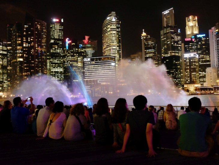 Dehors, bars douteux et prostituées sympas. On a pris le métro pour aller se balader au centre-ville. Incroyable! Nous n’avions aucune idée de ce qu’on trouverait ici. Pas de recherche parce qu’on ne restait que 24 heures. Impressionnés par le nombre de coureurs, par les tours sur lesquelles brillent les logos des banques du monde entier, par les chefs d’oeuvre d’architectes… Bière à 16$, burger à 30$, entre les traders… Aïe! Et juste avant de repartir vers notre hôtel, super spectacle son et lumière gratuit sur l’eau. Quelle soirée!