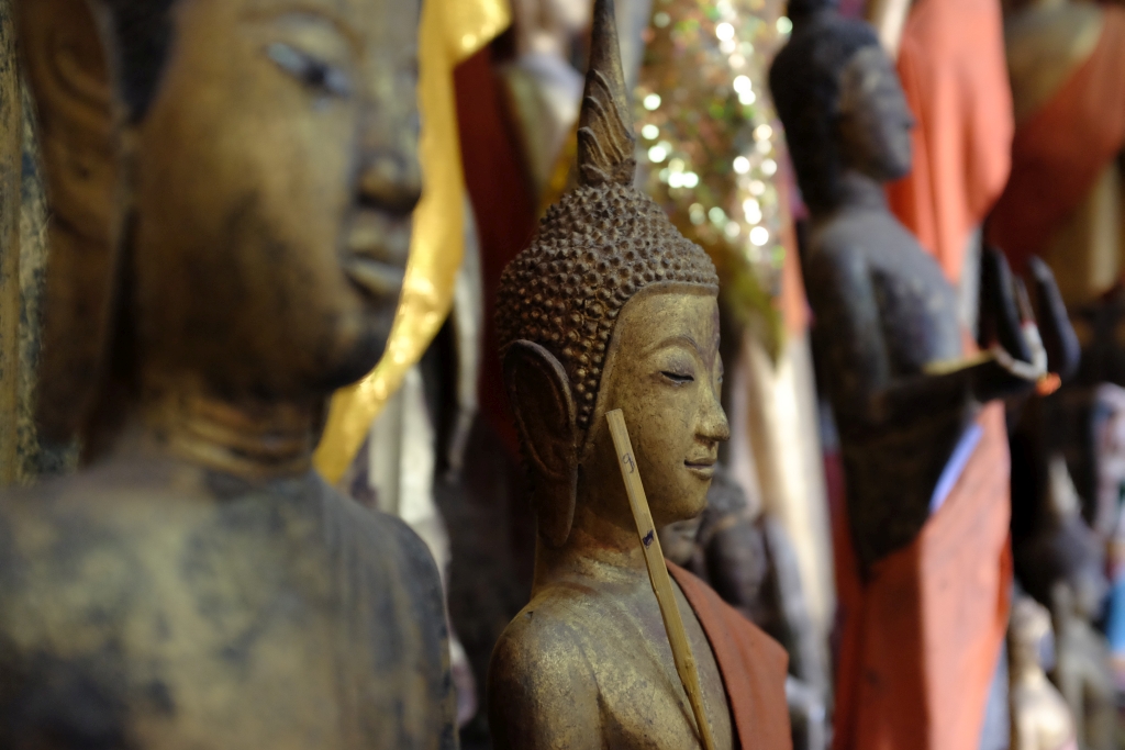 -Ses temples: colorés, à l’architecture compliquée qui mélange sculptures, fresques, peintures dorées au pochoir et marqueterie. Le temple sur le mont Phousi est chouette à cause de la balade pour s’y rendre et la vue mais c’est celui de Xieng Thong (le monastère de la cité d’Or) qui m’a paru particulièrement magique.